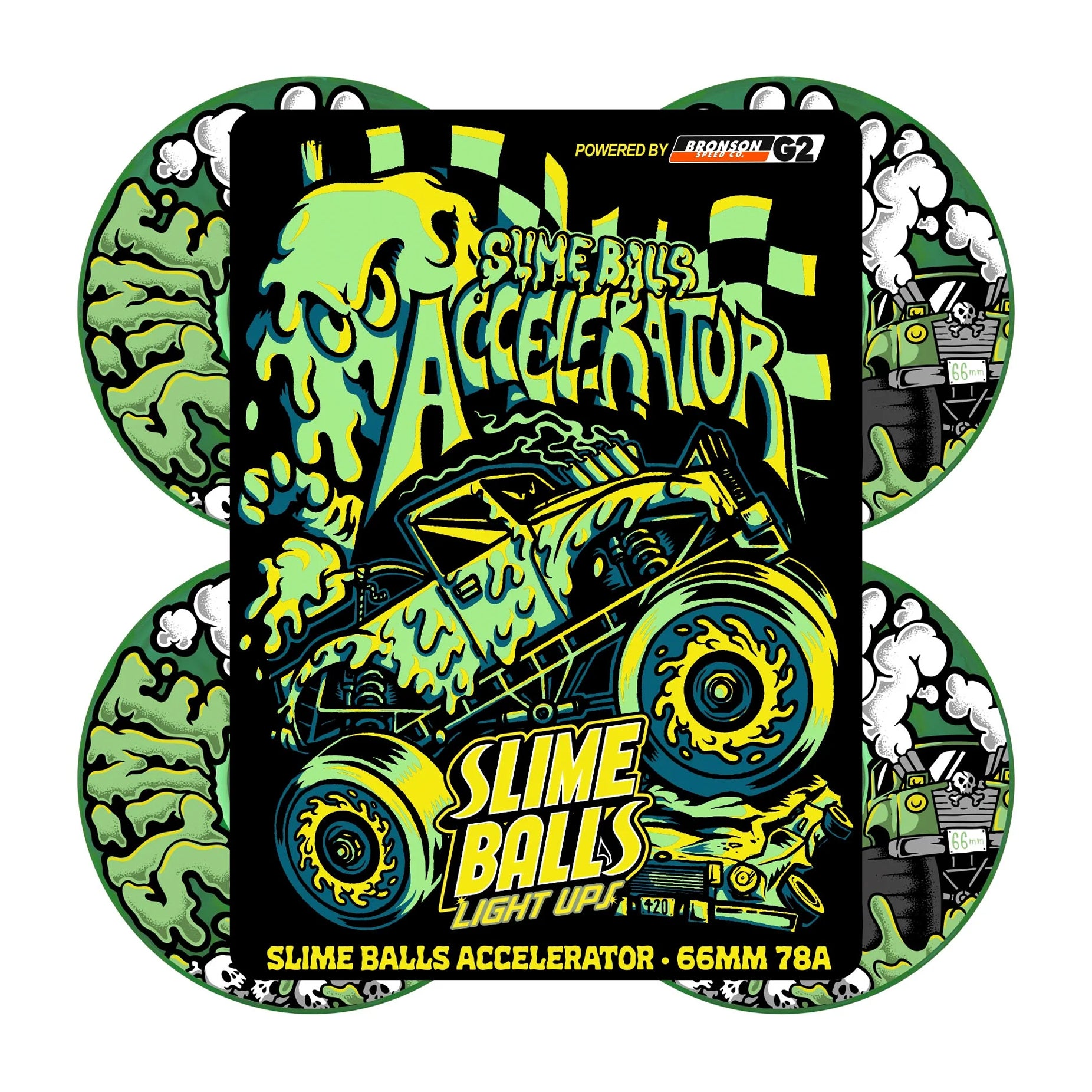 Slime Balls Accelerator Trans Green OG Slime Light Ups 66mm, 78a Wheels with glow in the dark graphics.