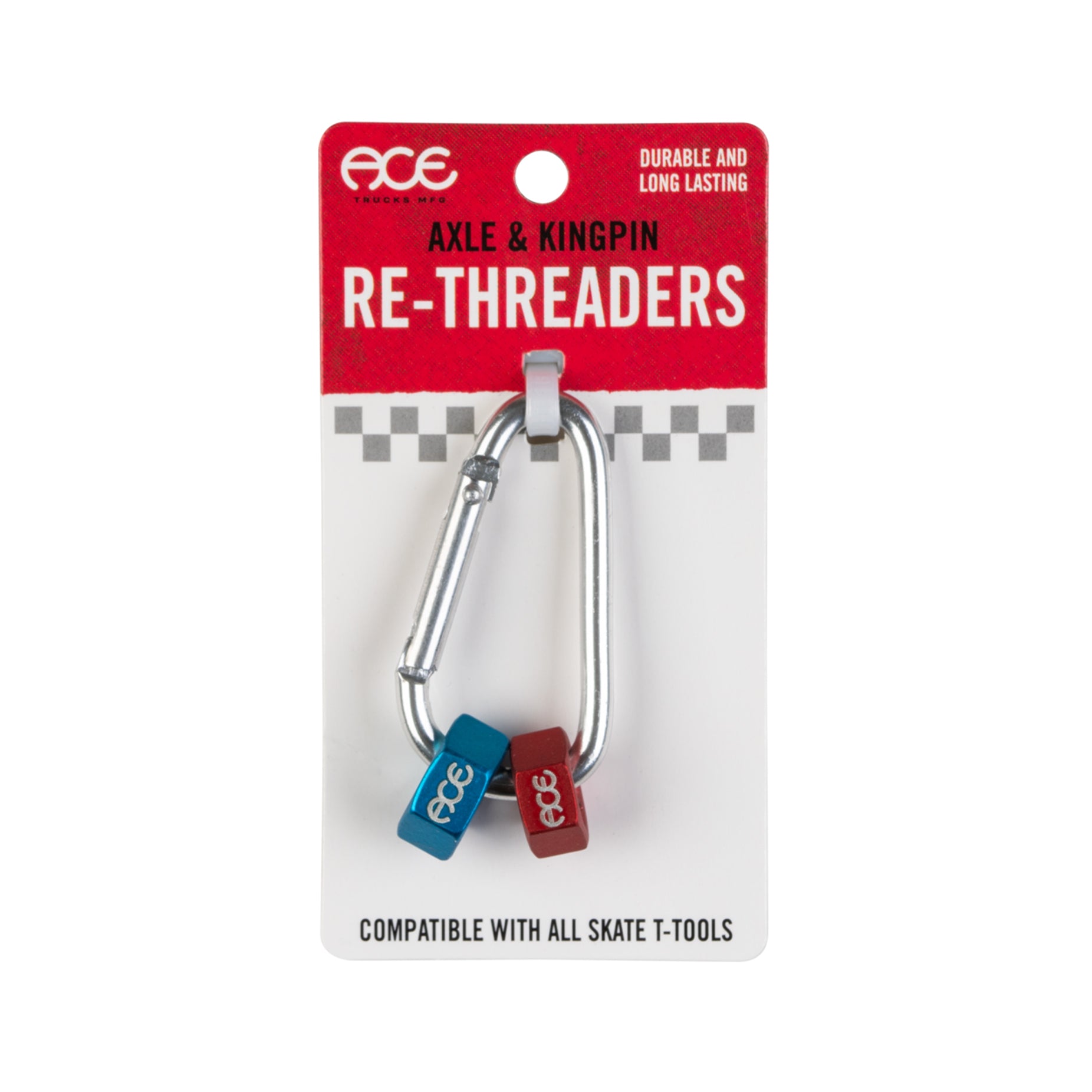 What are these? These hardened steel dies (nuts) drop into any skate tool or wrench for that matter and allow you to "chase" (re-thread) your damaged axle ends or kingpins. The carabiner is a handy way to keep track of these dies as you are sure to become the most popular person at every session when you are rockin' these.