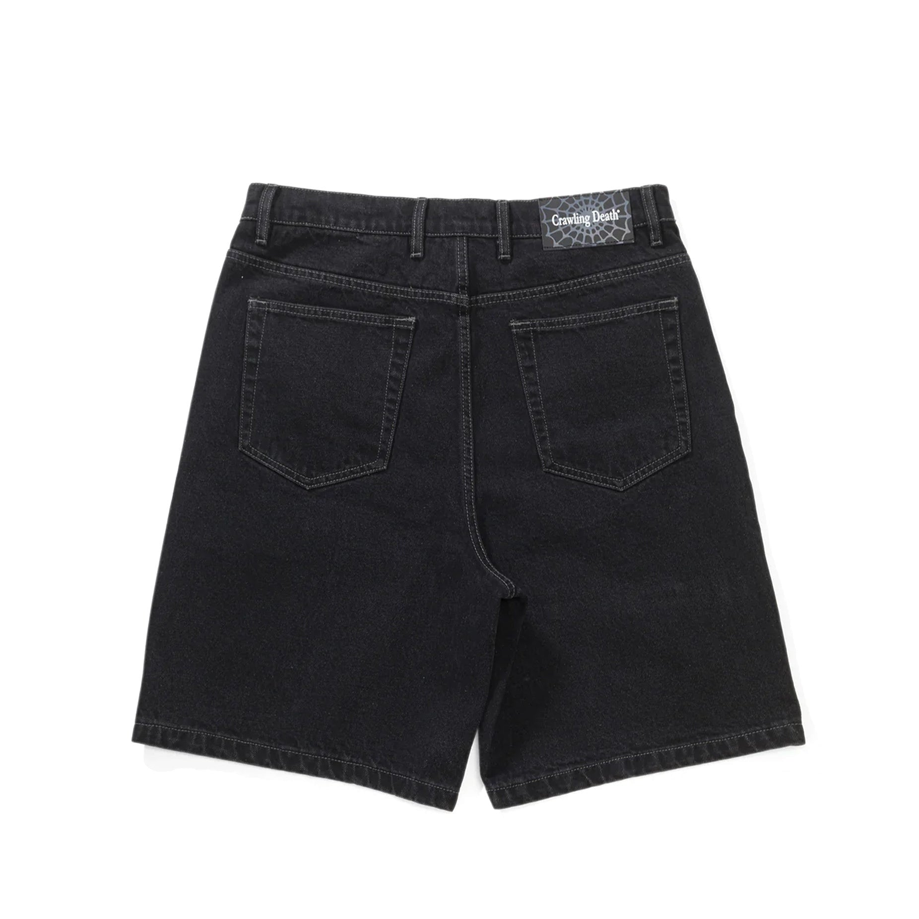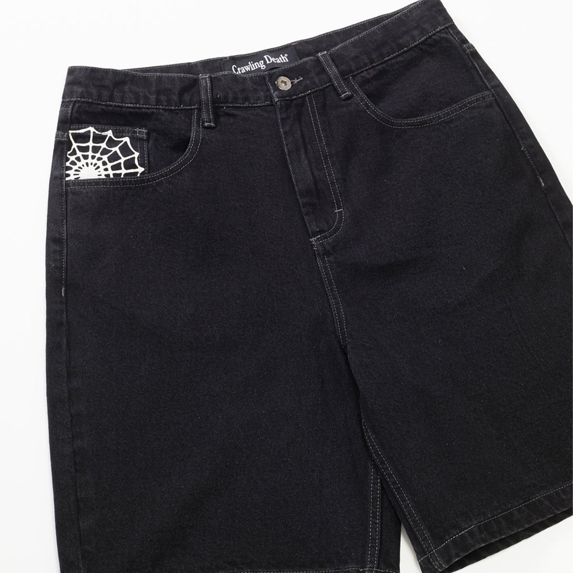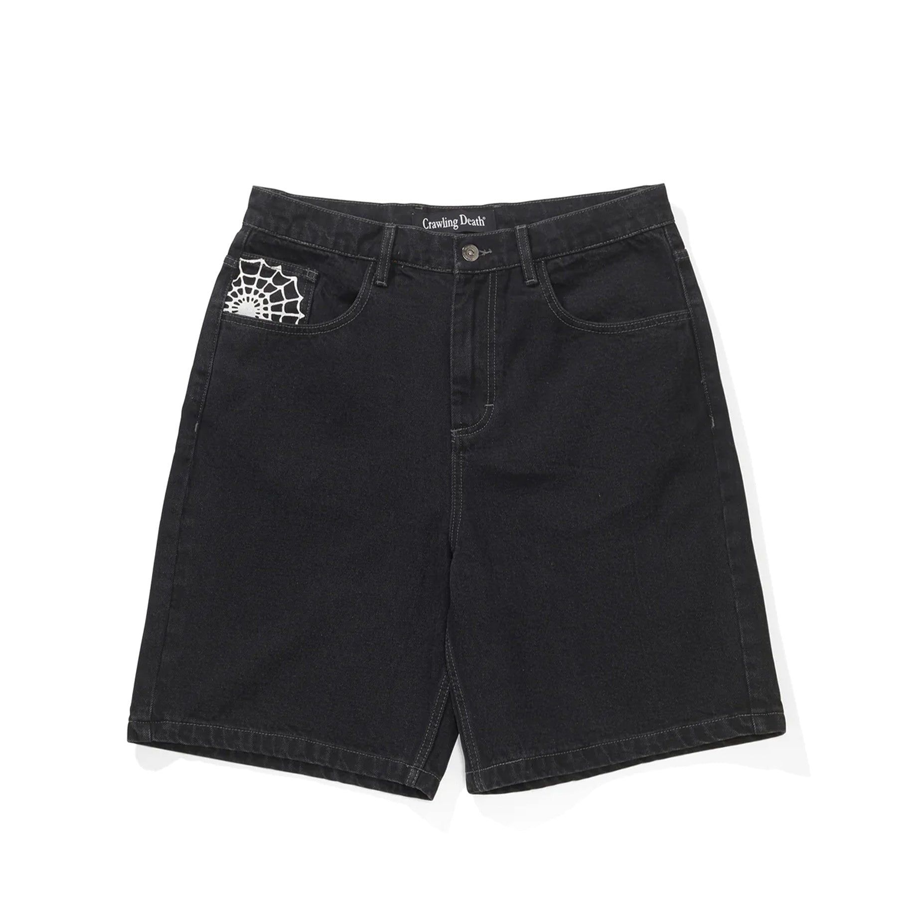 Crawling Death Web Denim Shorts - Washed Black