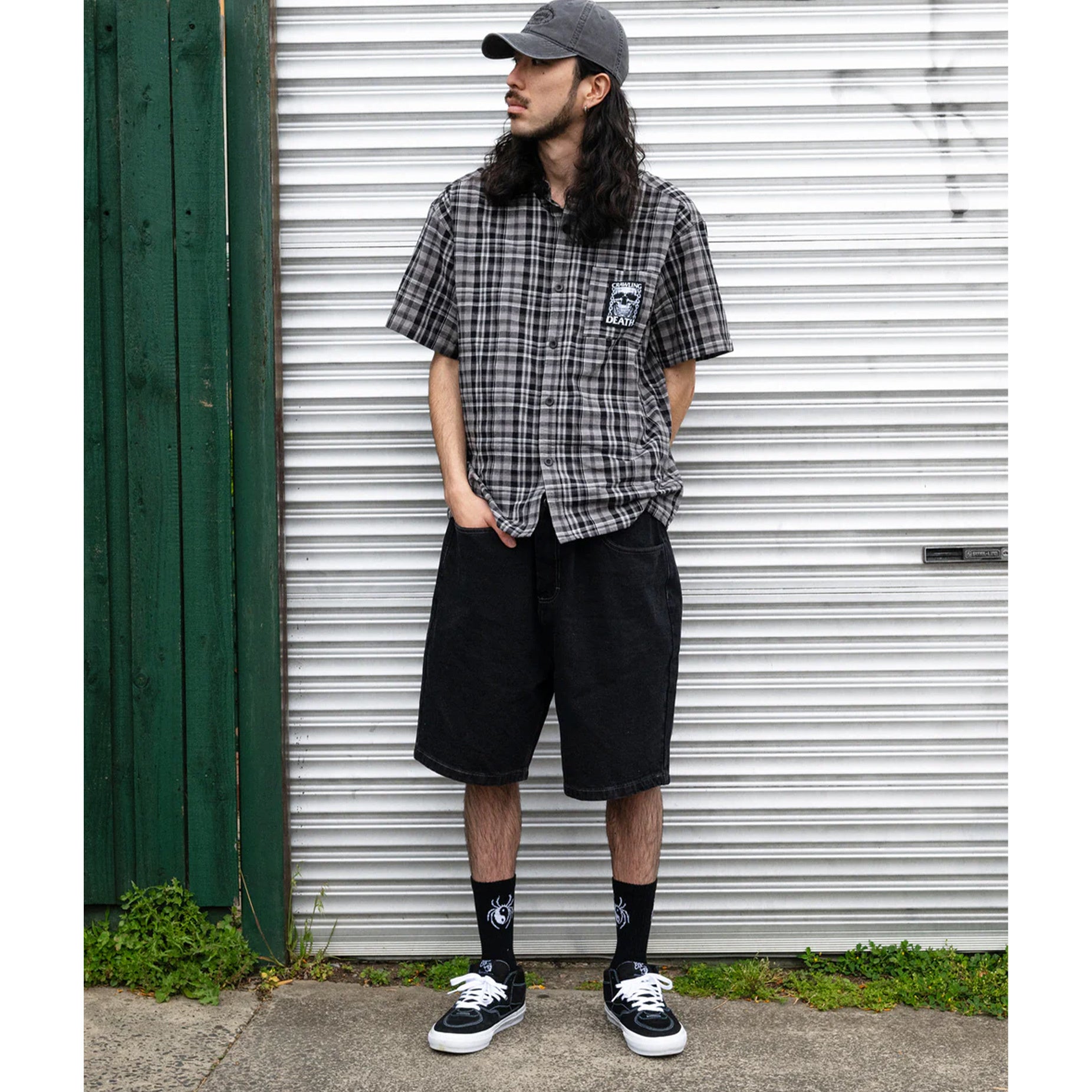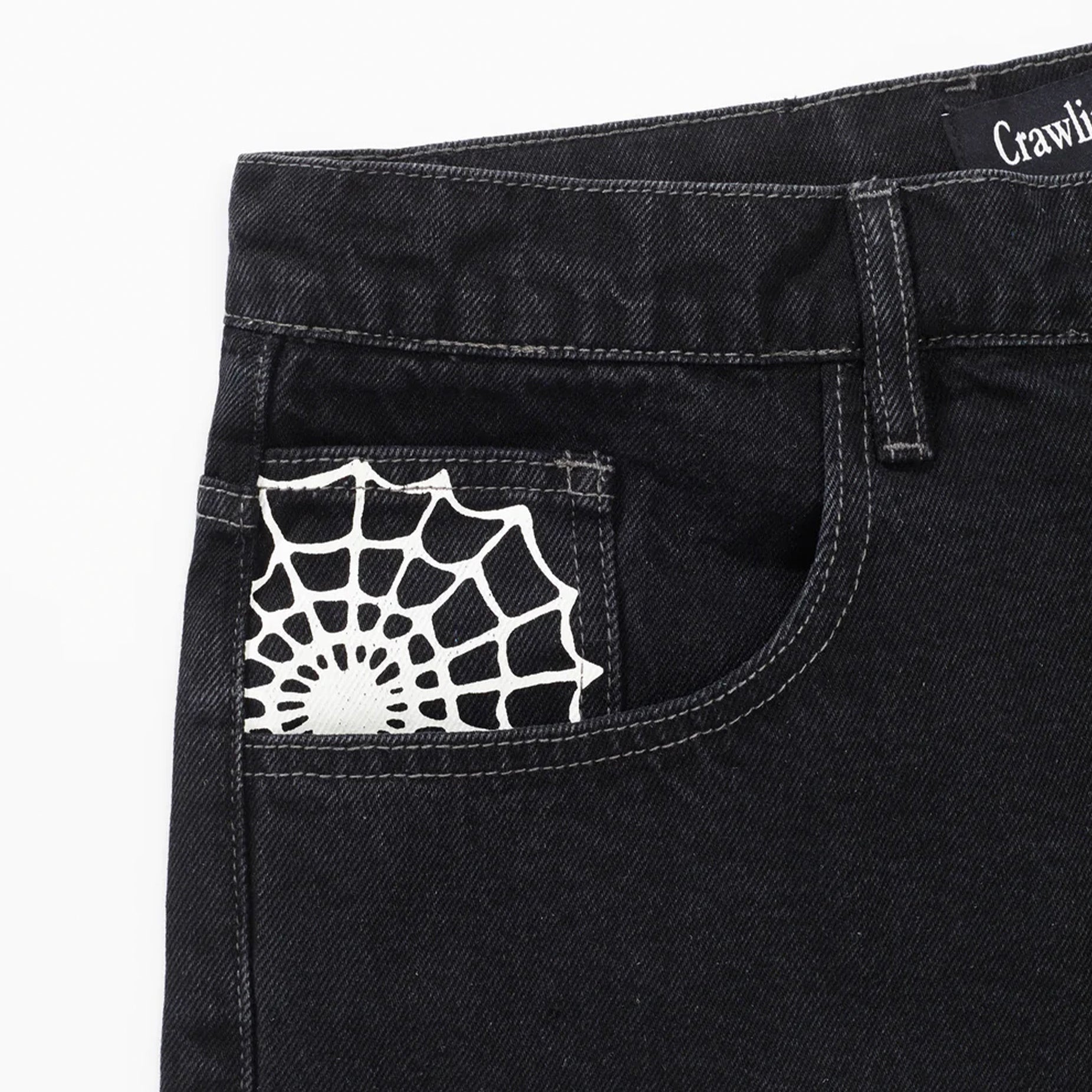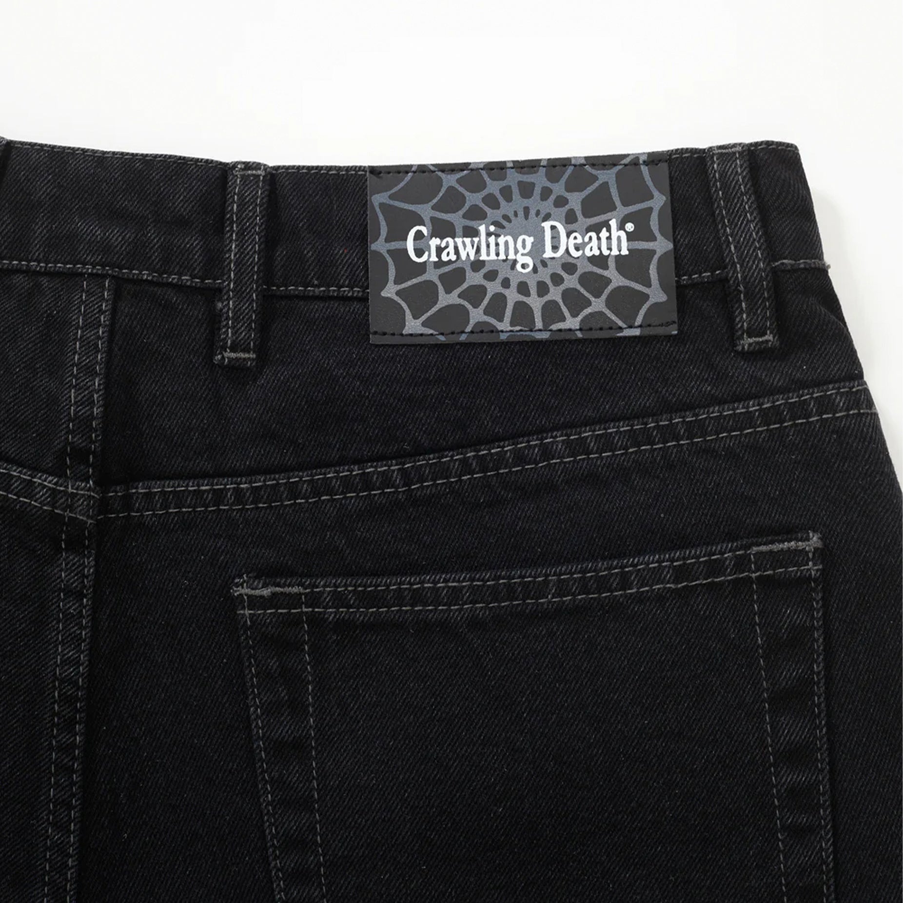 Crawling Death Web Denim Shorts - Washed Black