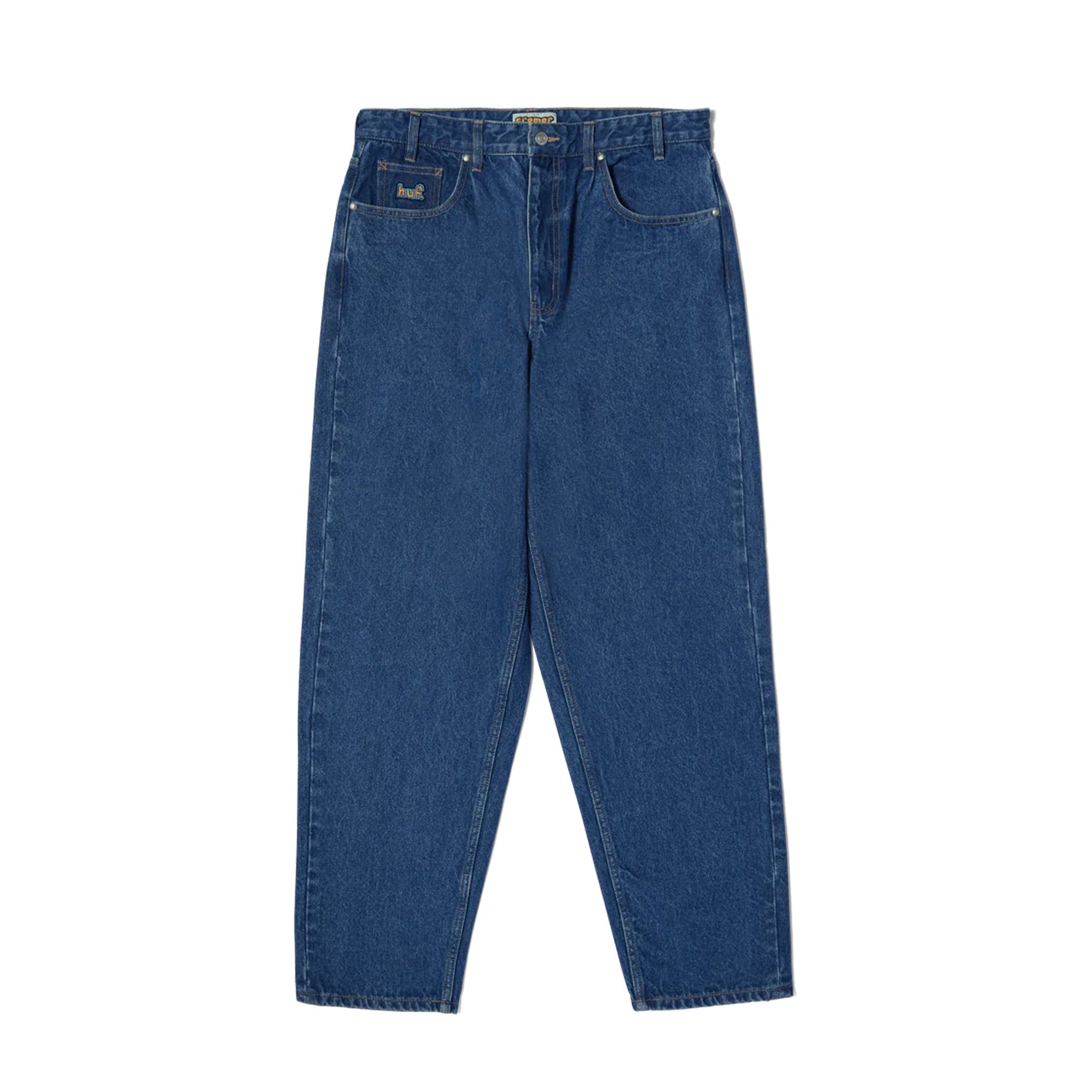 The Cromer Denim Pant is designed in collaboration with HUF team rider Brad Cromer for a '90s-inspired baggy jean combining all aspects of Brad's favourite pants. Made of heavy-duty cotton denim, this everyday skate pant is reinforced at critical seams and features an embroidered HUF logo at the coin pocket, a Cromer label at the waistband, and a generous taper at the leg.