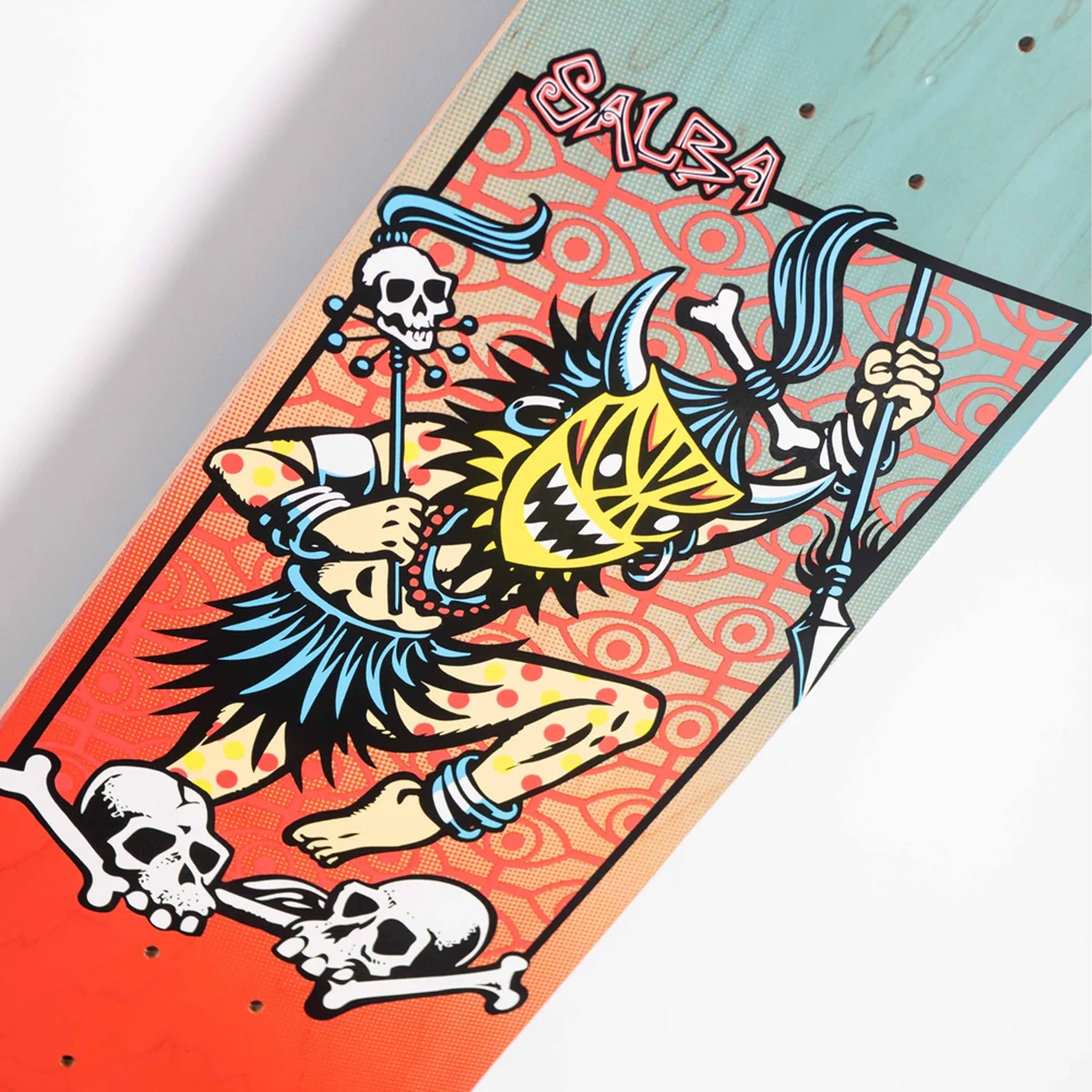 Salba Voodoo artwork on a blue to orange fade veneer with a 14.375" wheelbase. |