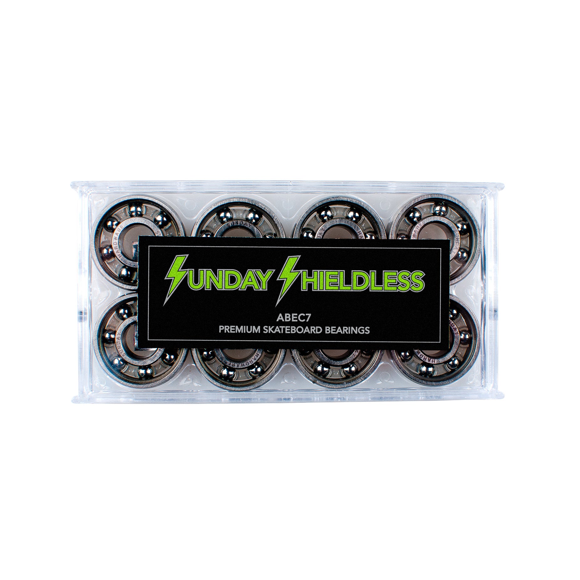 Sunday's iconic Shieldless bearings. Premium bearings with the shield pre-popped & protected.